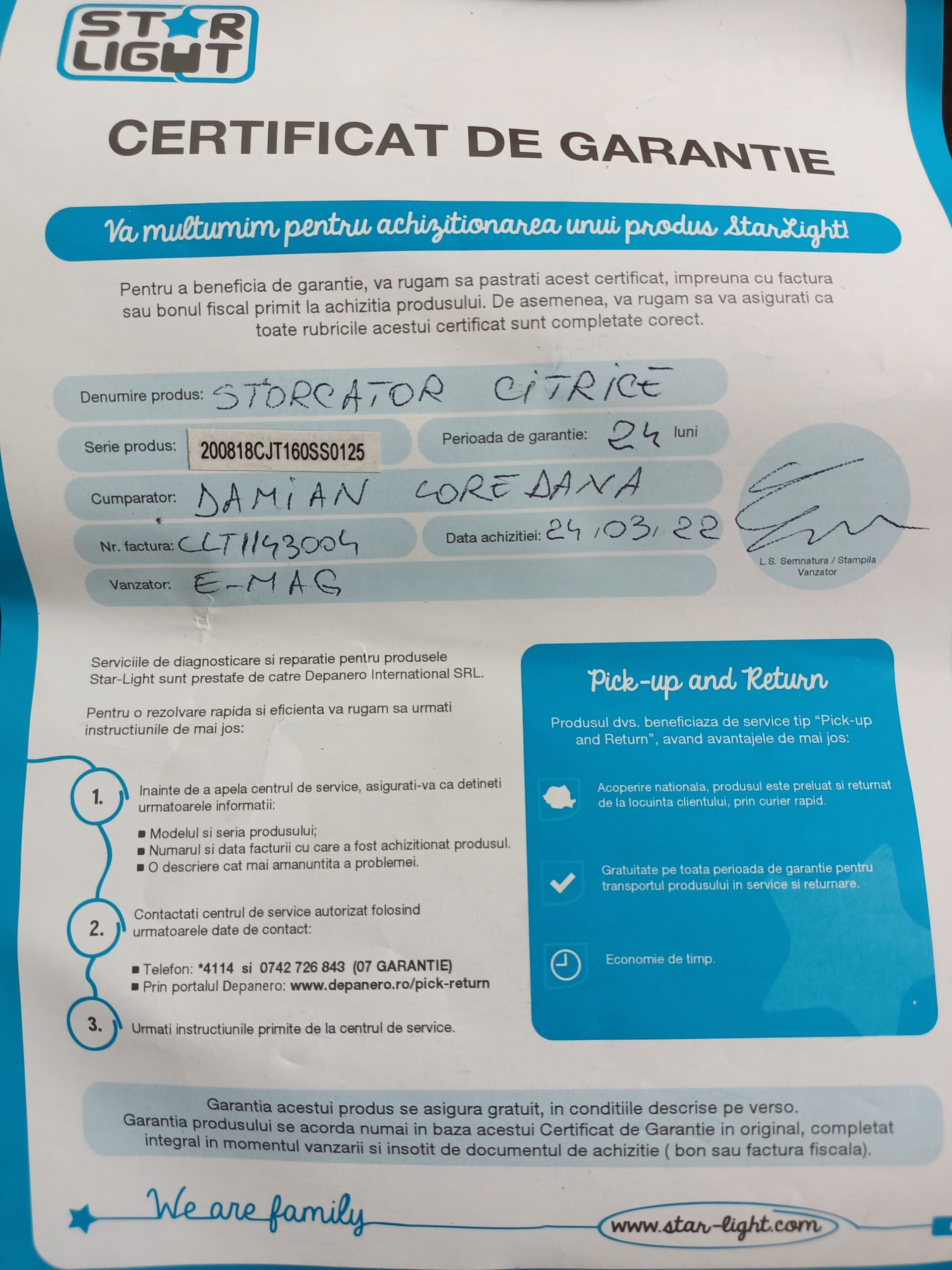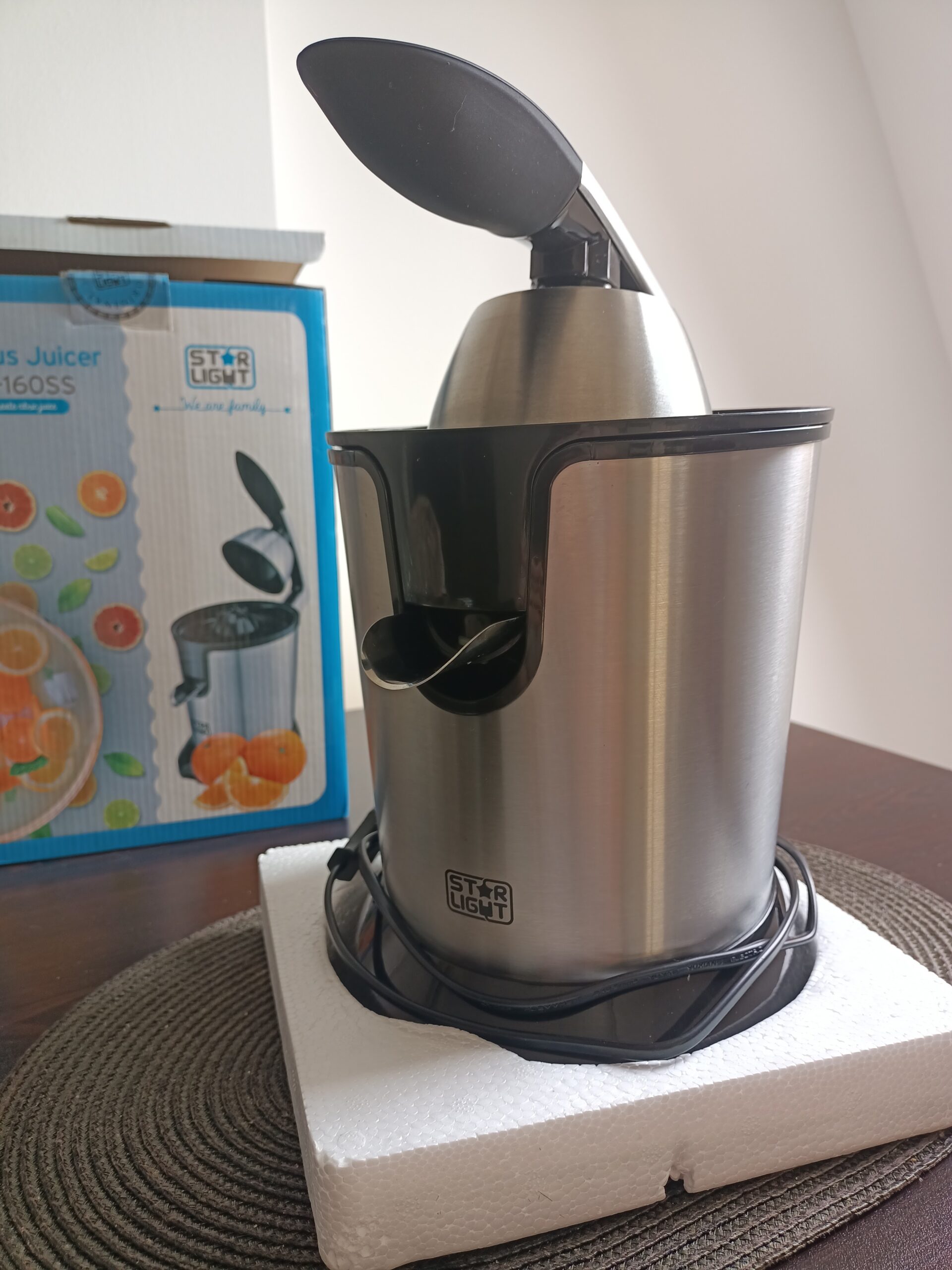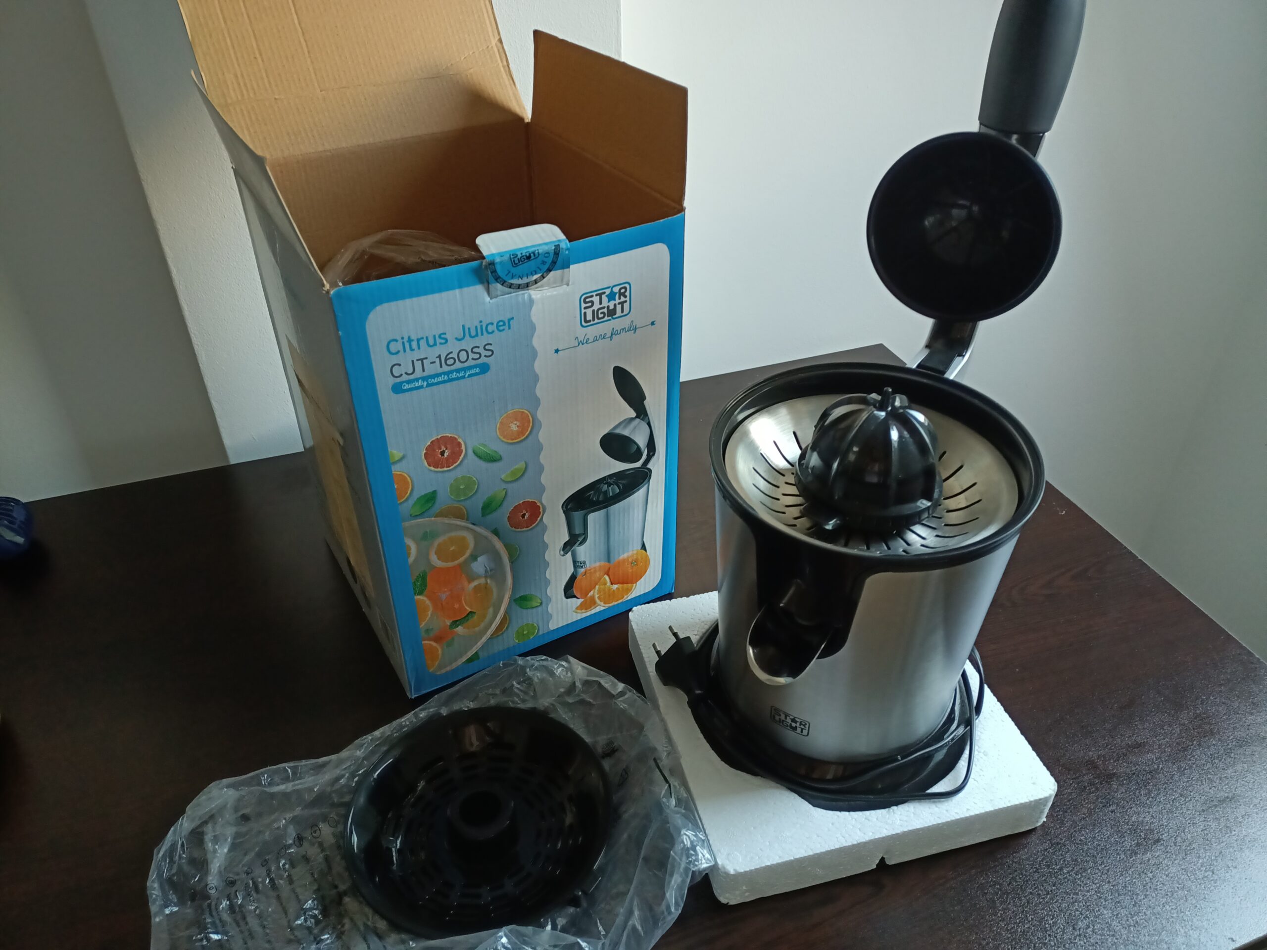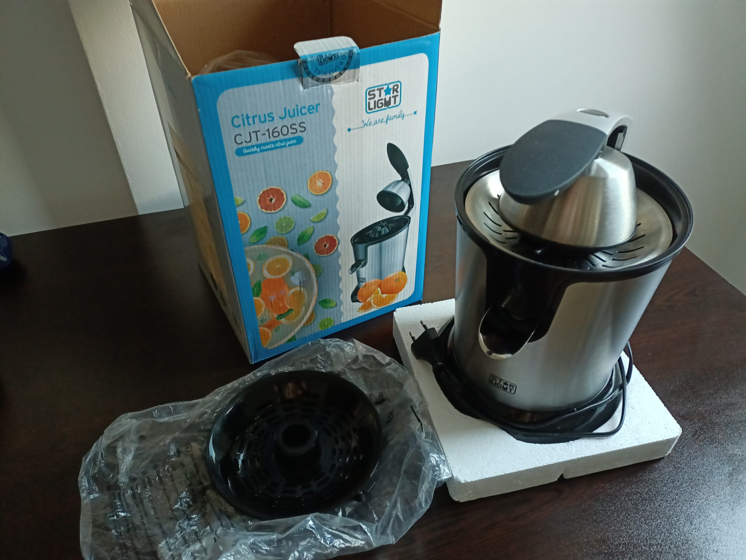 Vând storcator de citrice StarLight, model CJT-160SS din inox, gri cu negru. Are doua tipuri de site, din inox și din plastic și permite stoarcerea atât a citricelor de mărime mare cât și cele mici. Are certificat de garantie.